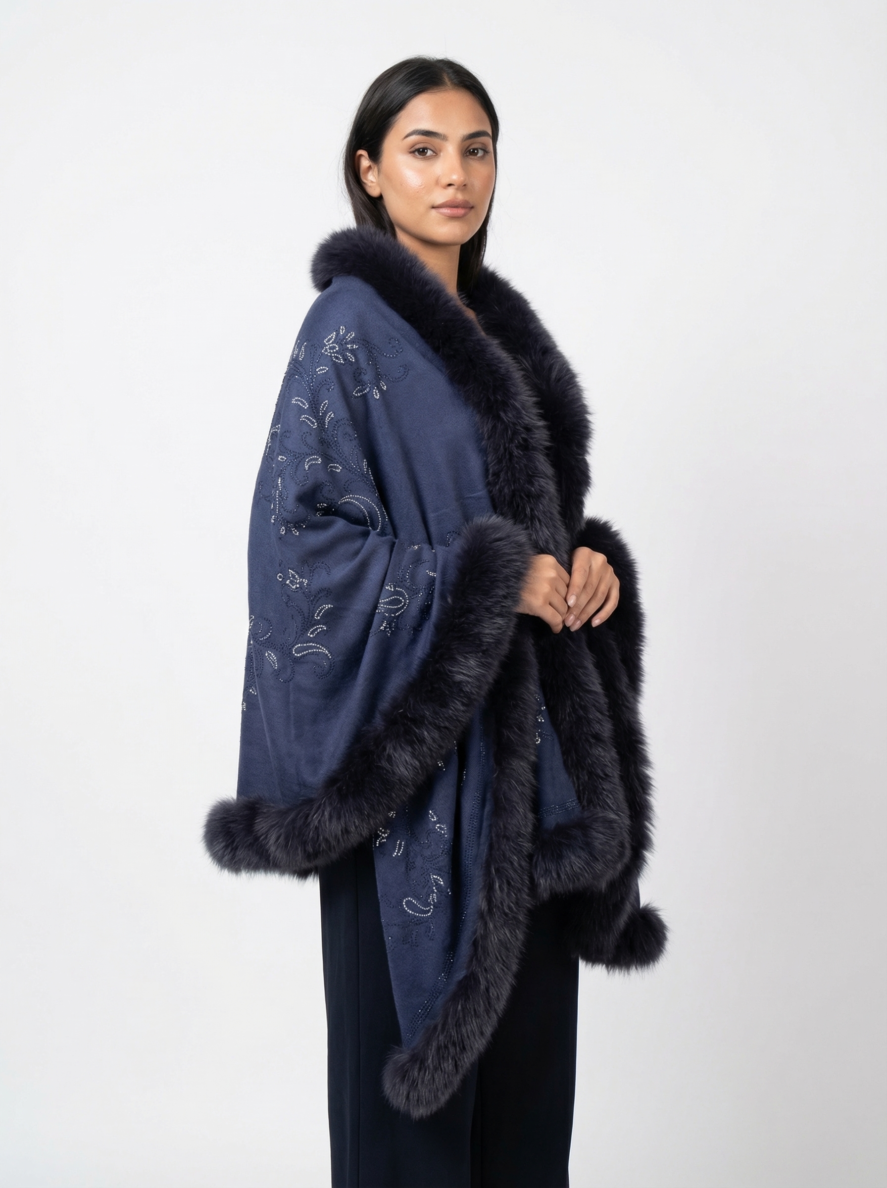 The shawl is finished with a rich fur trim along the borders, enhancing both warmth and visual drama while lending a regal touch. Designed in a versatile 70 × 200 cm size, it drapes beautifully over the shoulders or wraps gracefully for an effortlessly sophisticated look.
