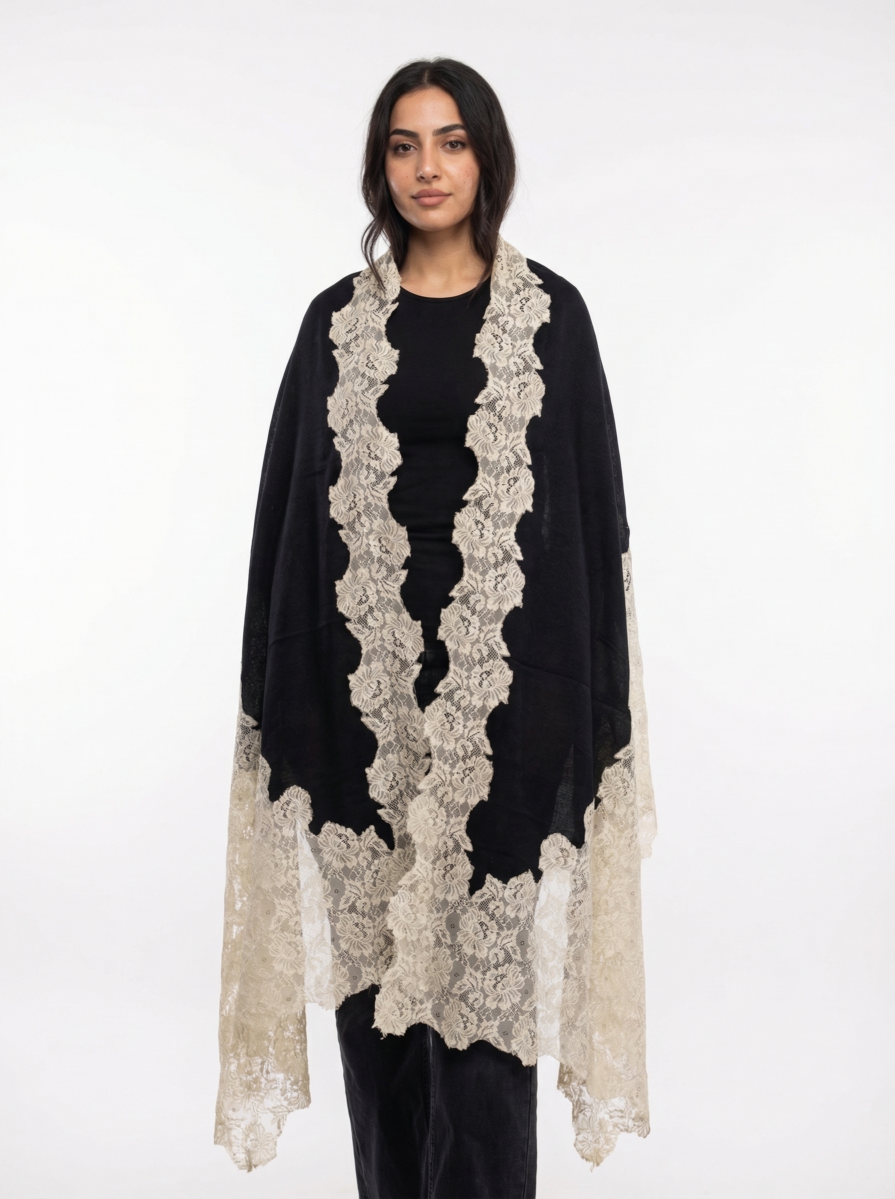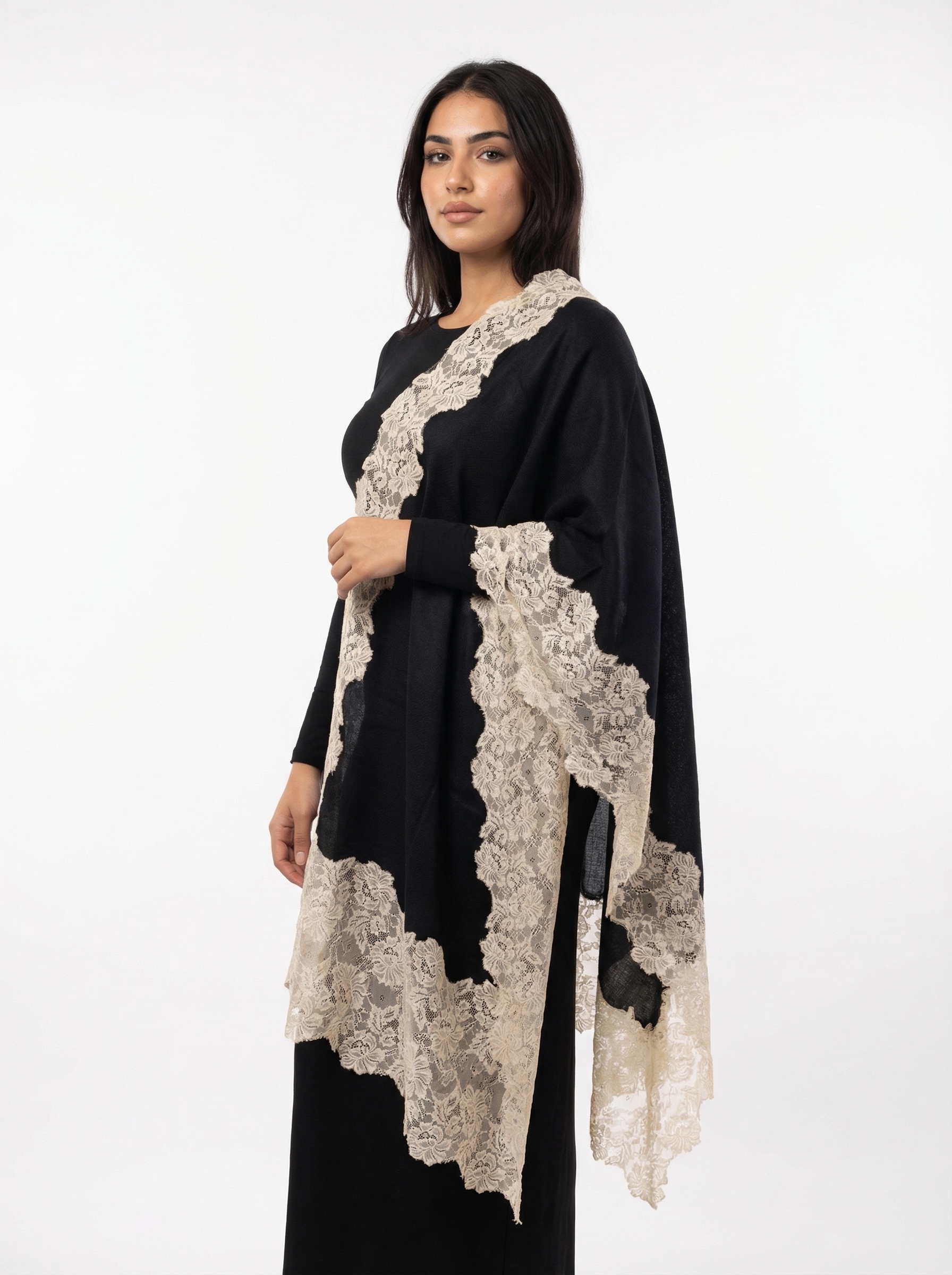 - Premium Pashmina Shawl with Floral Lace – Beautifully crafted pashmina shawl enhanced with delicate floral lace, giving the shawl an elegant and luxurious designer look.
